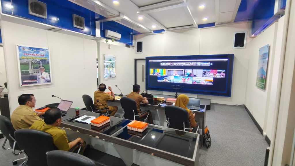 KARANGANYAR – Bidang TKI (Diskominfo Karanganyar) Fasilitasi zoom meeting kegiatan rapat Pengendalian Inflasi Daerah yang diselenggarakan secara online pada hari Senin, 29 Januari 2024 di Ruang SIC Diskominfo Kabupaten Karanganyar. Perlengkapan ruangan SIC, Sound system, layar videotron, perangkat PC yang terkoneksi jaringan, dan operator zoom telah di persiapkan 30 menit sebelum acara dimulai. Support IT Bidang TKI (Diskominfo).