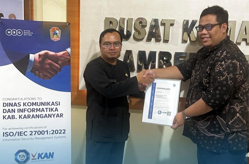 Karanganyar, 16 Oktober 2025 – Dinas Komunikasi dan Informatika (Diskominfo) Kabupaten Karanganyar resmi menerima Sertifikat ISO/IEC 27001:2022 tentang Sistem Manajemen Keamanan Informasi. Penyerahan dilakukan pada Kamis (16/10/2025) siang di ruang Kepala Dinas Kominfo Karanganyar.