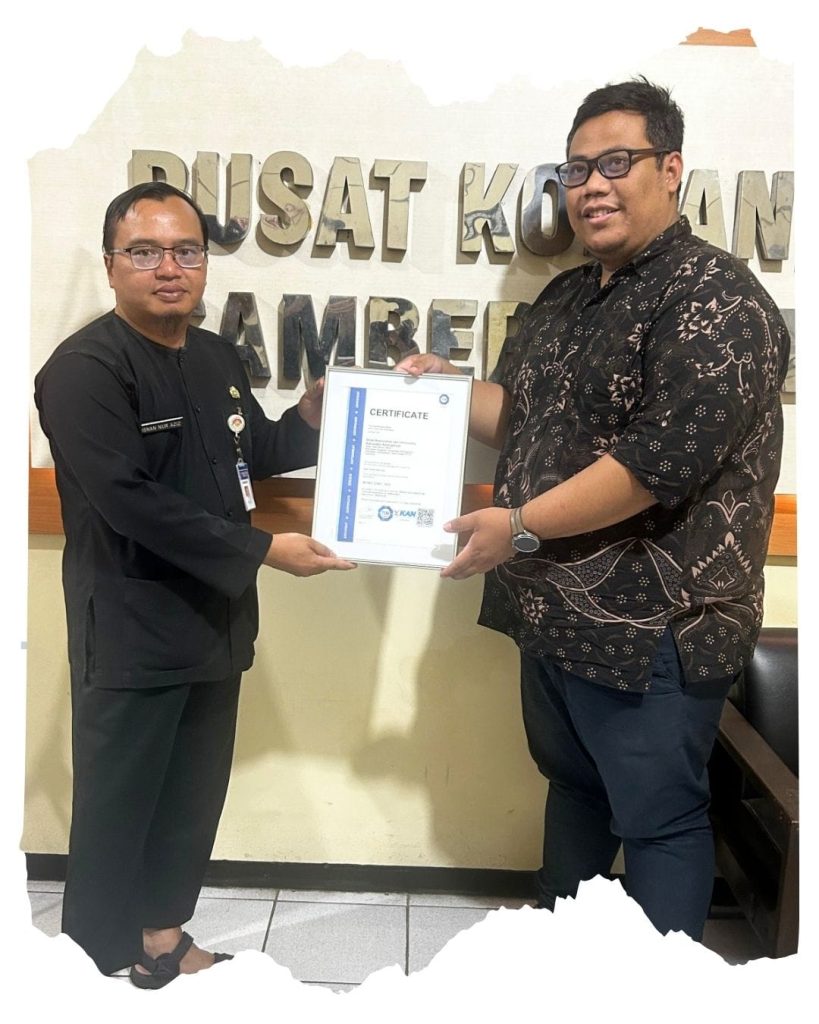 Sertifikat tersebut diserahkan oleh Herawan Saputra, General Manager PT Mitra Berdaya Optima, kepada Isnan Nur Aziz, S.Kom, selaku Kepala Dinas Komunikasi dan Informatika Kabupaten Karanganyar.